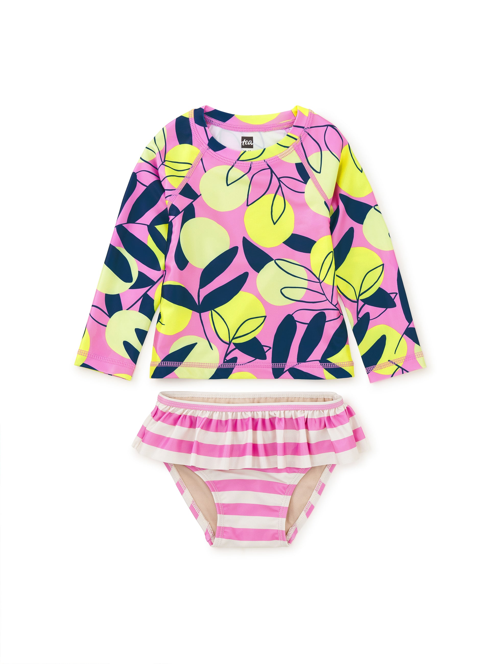 It's safety first with UPF 50+ sun protection in this rash guard swim set. Fashion comes in a close second, featuring a vibrant graphic on the long raglan sleeve top--and ruffles for the diaper-friendly bottoms with an interior lining for extra protection. Poly/spandex blend for the right bit of stretch. We recommend hand washing and laying flat to dry to extend the life of this set.